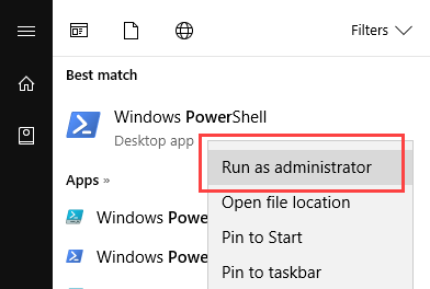 To run Power Shell as administrator in Windows 10, simply search for “Power Shell” in the search bar located down left beside the Windows menu icon. Then, right click on the Power Shell program that pops up, or the Power Shell ISE one which I prefer, and select Run as Administrator in the resulting dropdown.